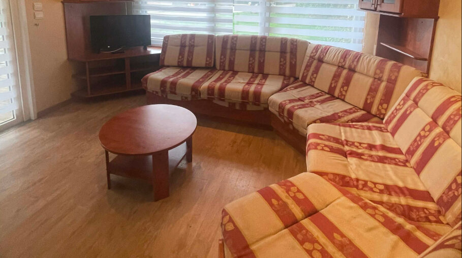 Banquette convertible, coin repas et télévision pour des moments conviviaux.